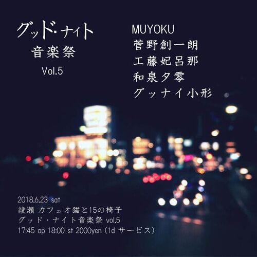 2018.6.23(土)『グッド・ナイト音楽祭 vol.5』17:45開場 18:00開演2000円 (1ドリンク サービス) muyoku菅野創一郎工藤妃呂那和泉夕零グッナイ小形 ご予約フォーム http://www.cafeo.tv/house/#reserve または 電話03-5673-2651にて受付。(※先着順です。) muy…
